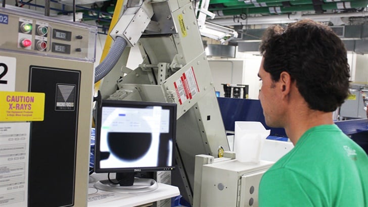 The metal chute is attached to an X-ray machine. Rafa’s tour guide, Kevin Ribeiro, a Team Leader in the Core Mixing division, points to an adjacent computer screen. It flickers with X-ray after X-ray, scanning the constructions of each ball.