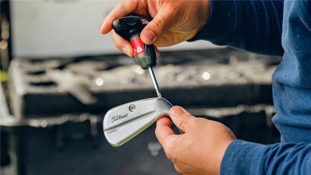 Now used for Titleist iron fittings are all-new T-Series SureFit irons. The new design gives fitters the ability to adjust lie angle (2 degrees flat to 4 degrees upright, 1-degree increments), loft (2 degrees weak to 1 degree strong, 1-degree increments) and head weight (standard weight, -6 grams) on the fly and easier than ever before.