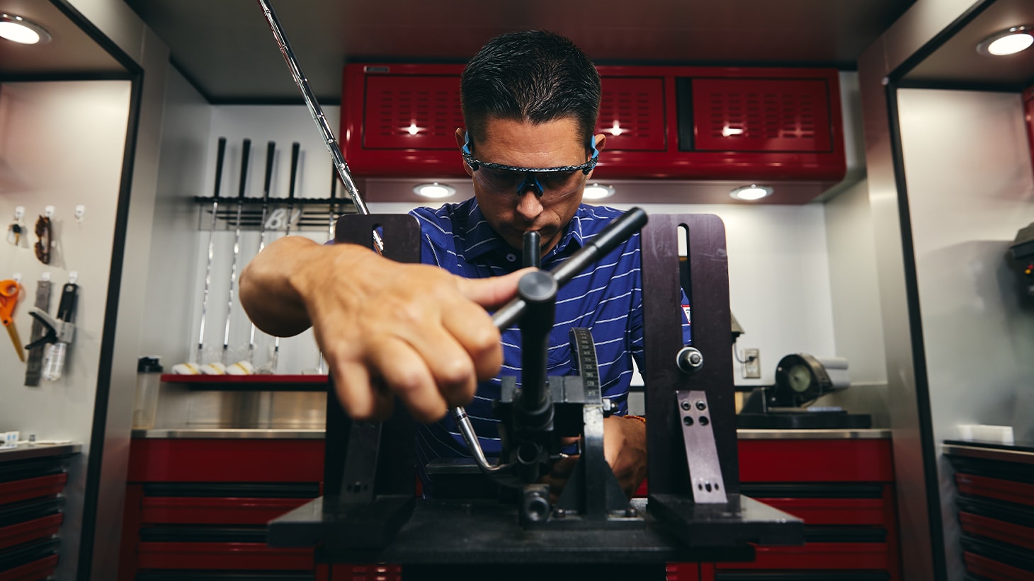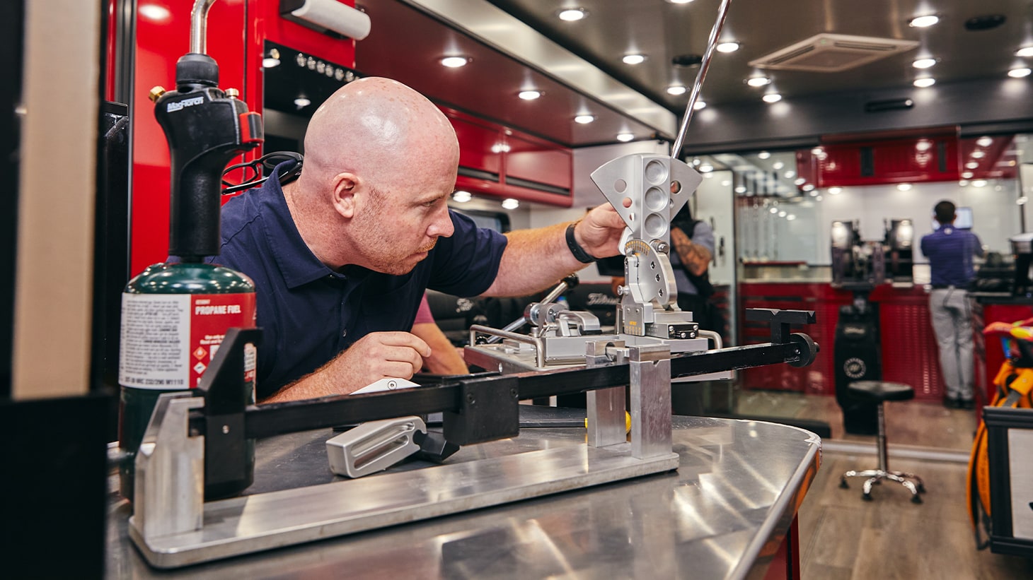 Built to withstand the 30,000 miles of annual travel across the country, the new Tour Trailer extends from 8.5 feet wide on the road to 15.5 feet on site, with four pop-out sections that contribute to 650 square feet of working space. Peter Bezuk, who multi-tasks as the truck’s combination driver and club builder, logs most of the mileage, crisscrossing the U.S. to more than 40 PGA Tour venues. When fully loaded, it meets the maximum weight allowed by the PGA Tour of approximately 35,000 lbs. (Fun fact: That’s about the same weight as a large bucket of 346,000 Pro V1’s.)