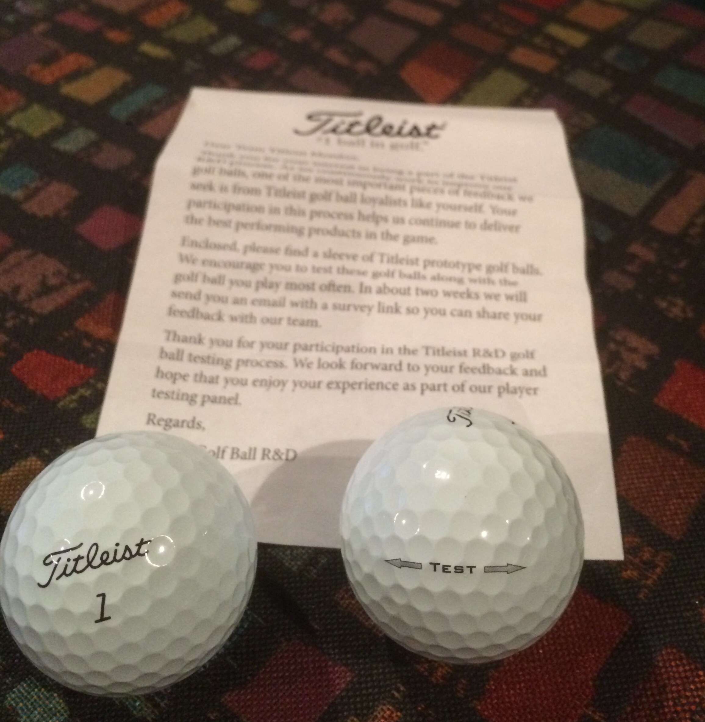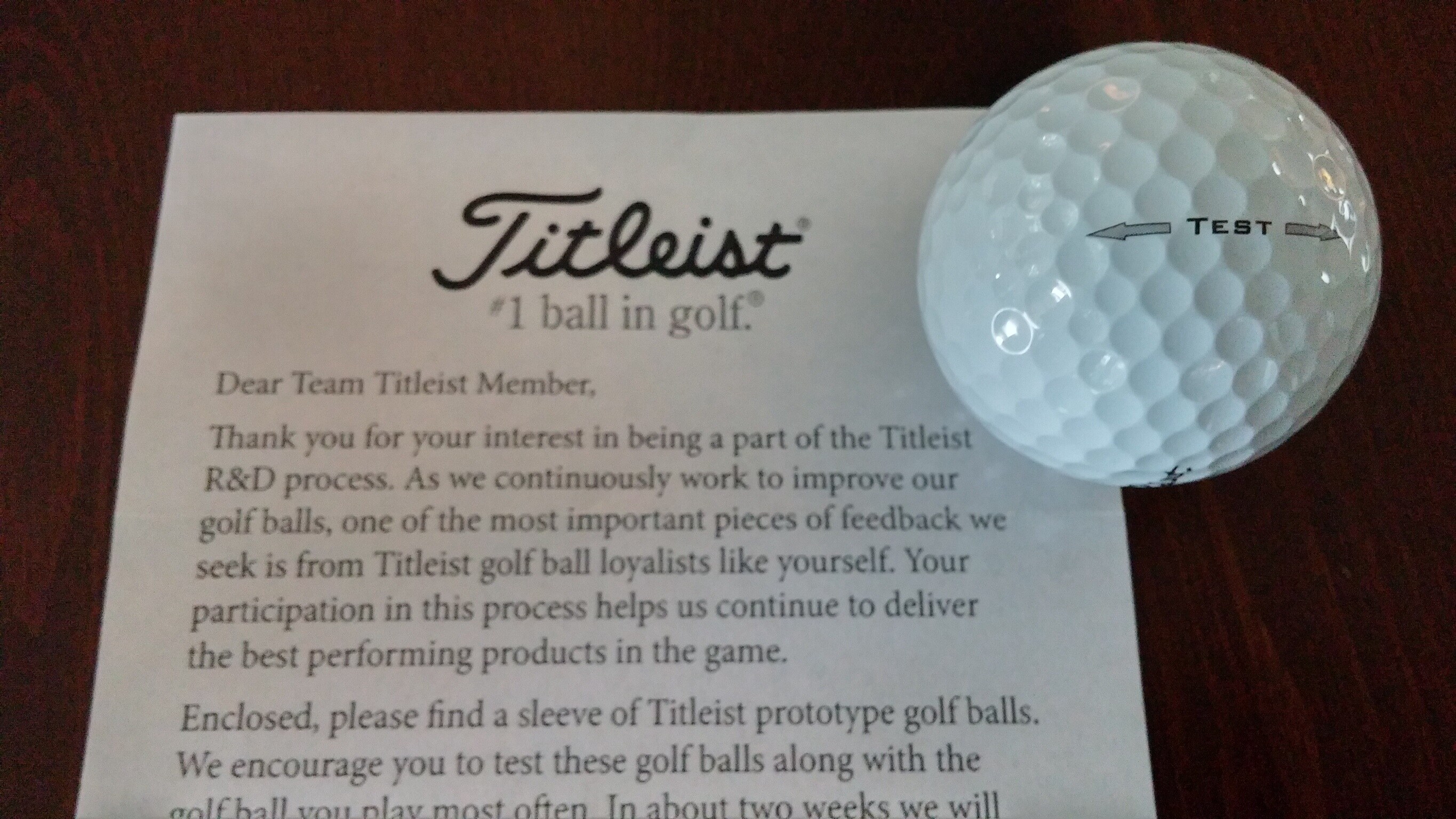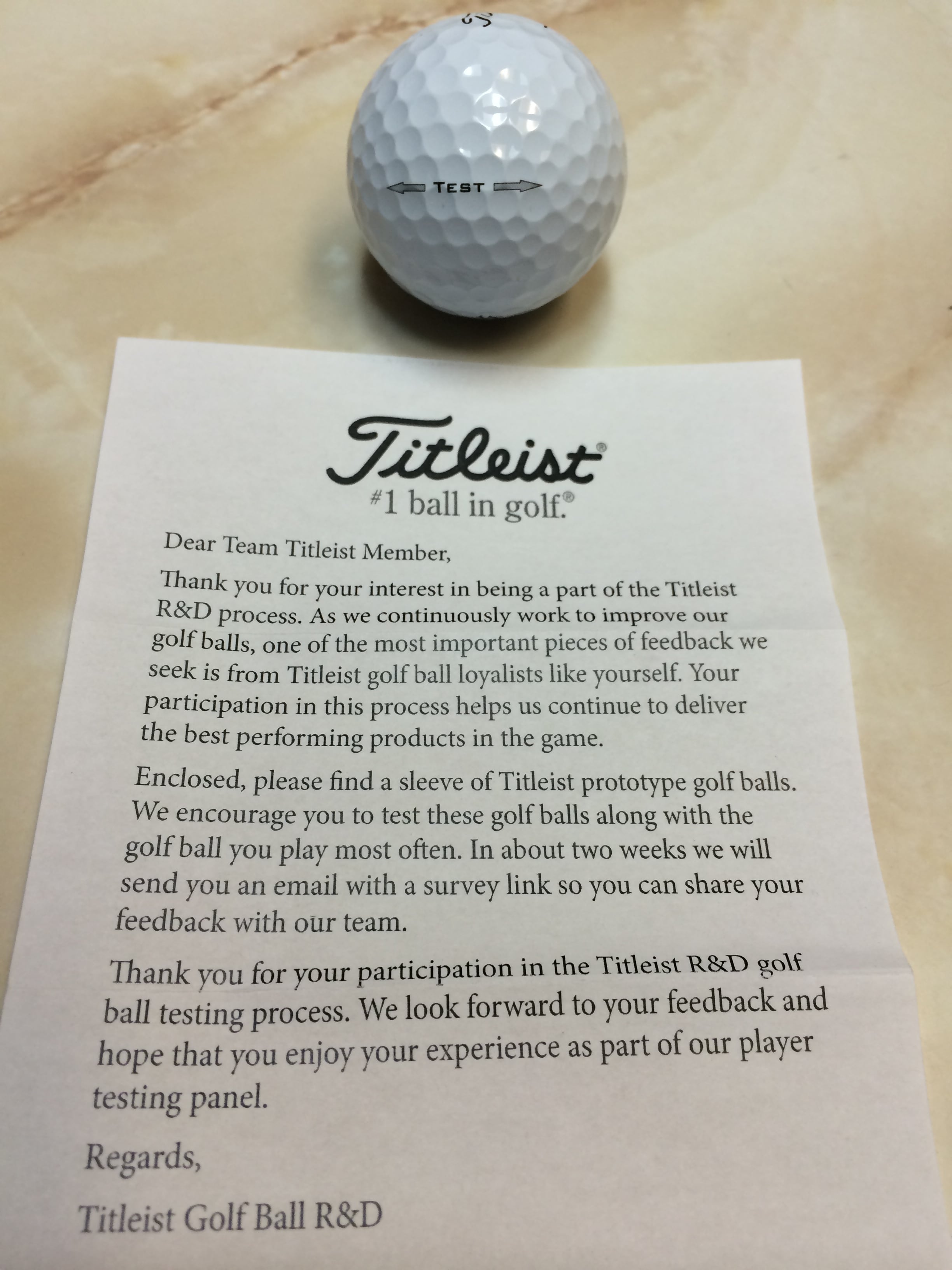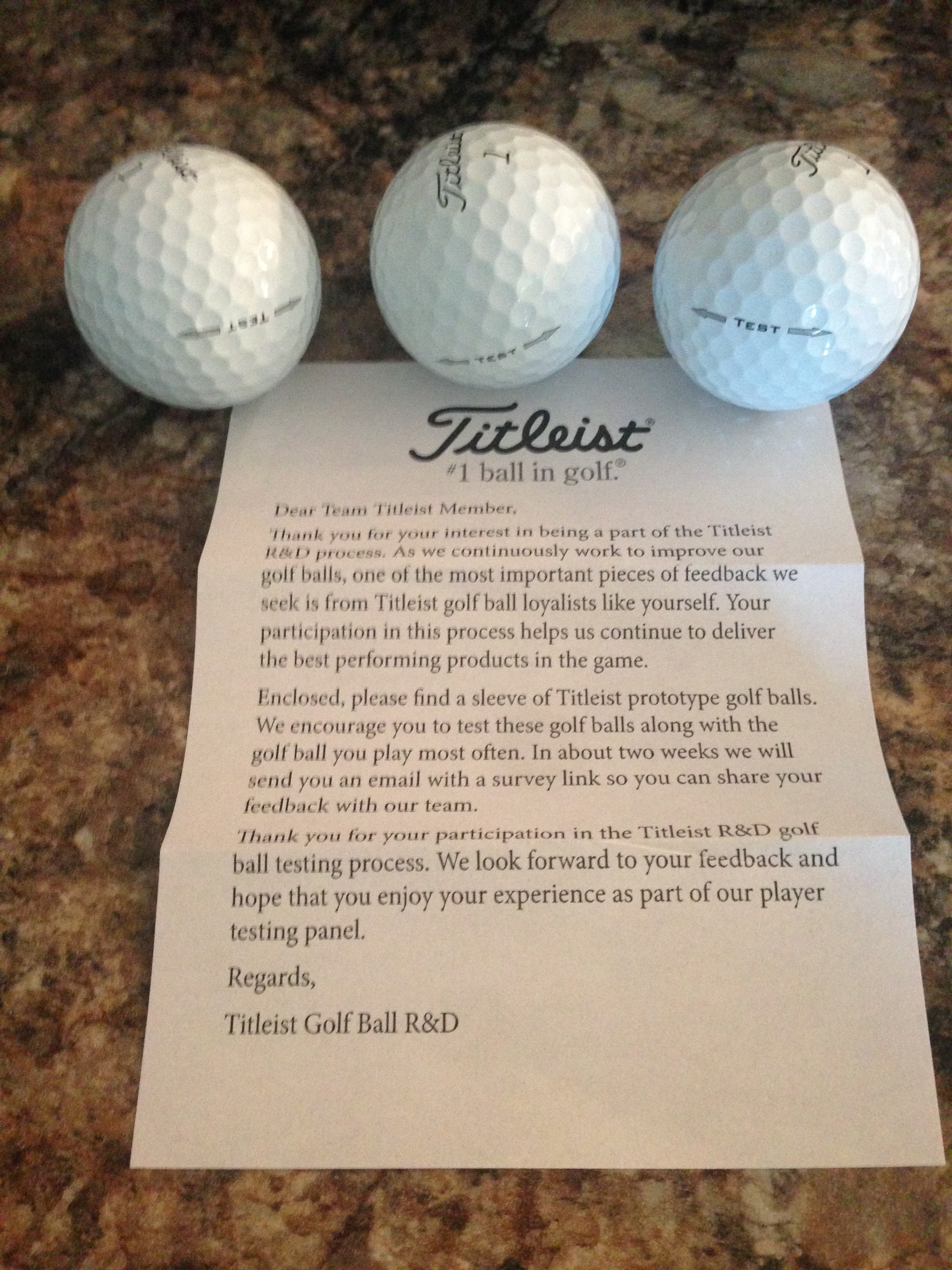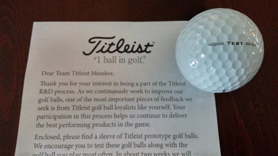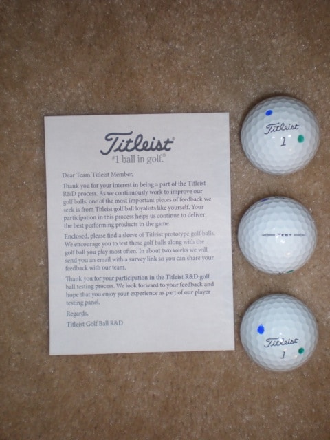 Thanks Titleist, received test balls yesterday. Quick test with putter, feels great, like all Titleist balls. Looking forward to "testing"over weekend.