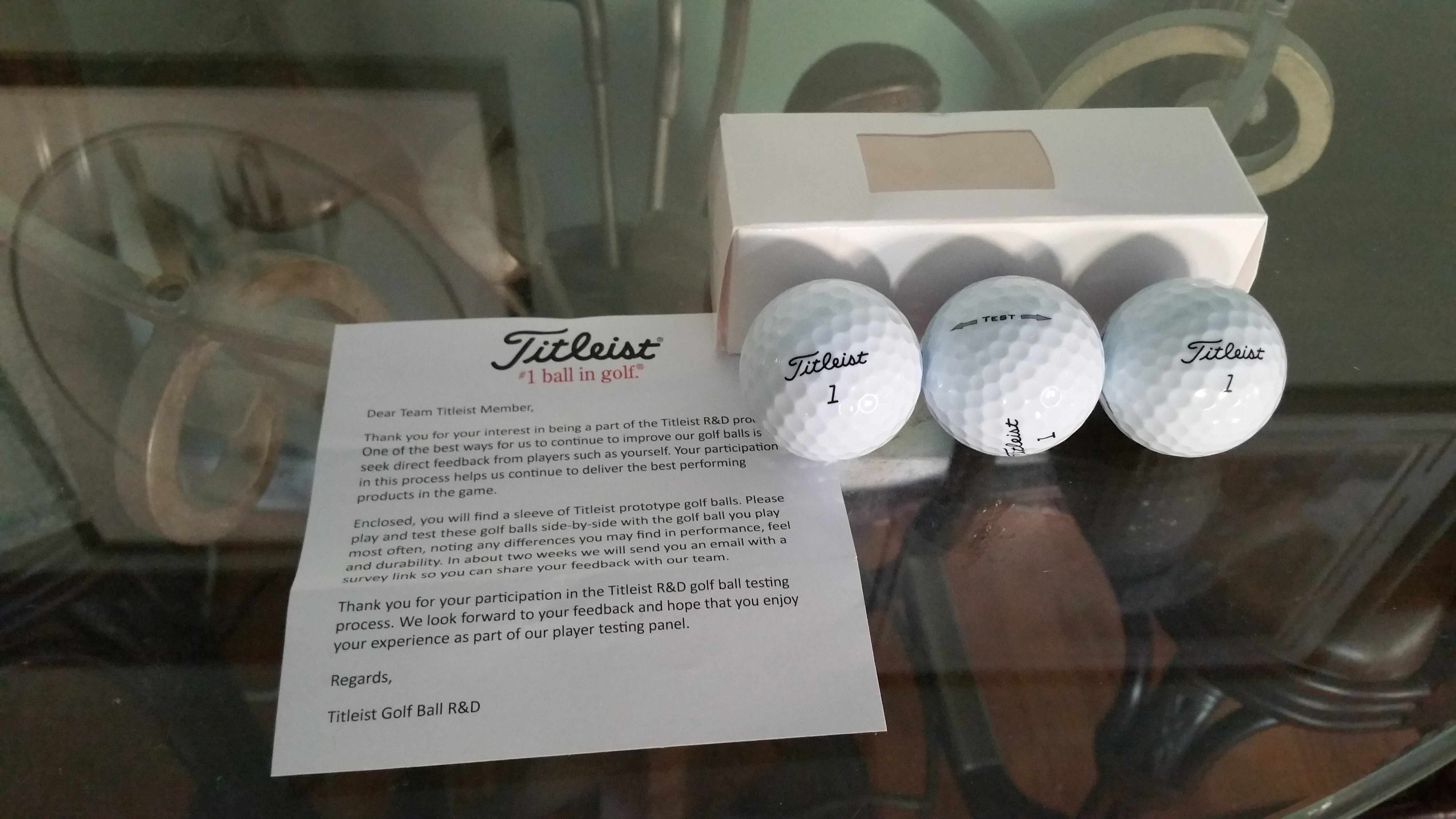I just received a sleeve of Titleist test balls in the mail today - thank you Titleist! The balls have an orange #1 on them. However, in my box, there was no letter with with instructions how to provide feedback ,etc....