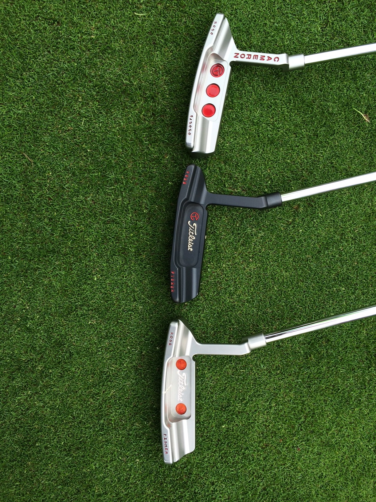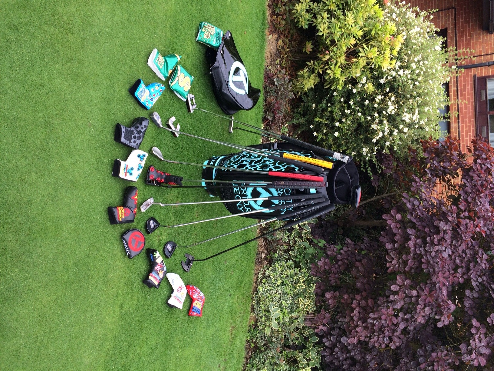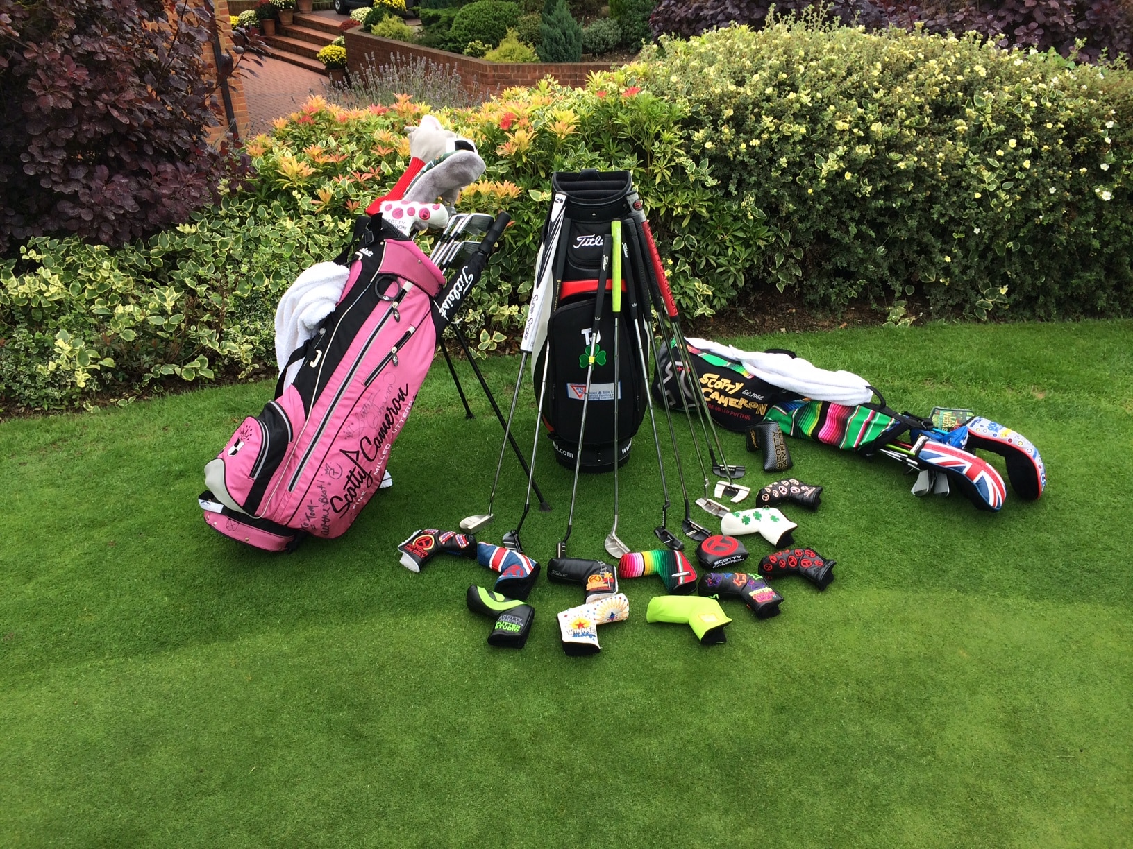 Yesterday I was at the UK Cameron Collector event at Bearwood Lakes in Berkshire. We had a small group of Cameron collectors and were delighted to be joined by Henry Byrne, Scotty's man in the UK, who showed us some rare and great putters. The collectors all brought along their best pieces of kit, so the practice green had about 40 or 50 serious putters, dozens of head covers, mostly Circle Ts and a variety or rare Cameron bags and a bunch of guys mostly wearing Cameron shirts.