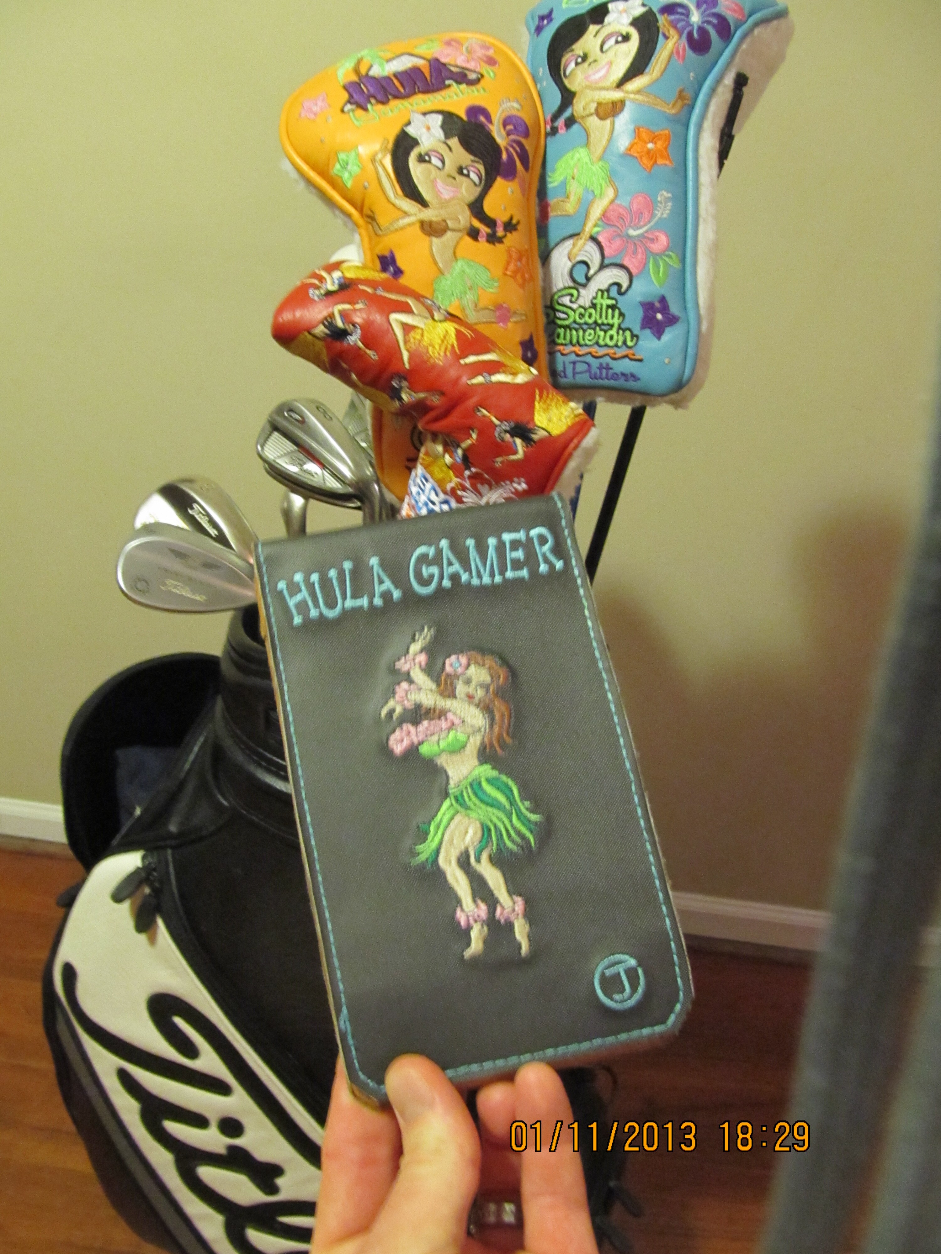 Here is my set up. Cameron Fans will notice a few cool custom touches to my bag, and a few super limited hulas that spend a bunch of time on the bag. I thought I would post this since I just picked up the cool Scotty Green Gator putter cover that will look great with my bag. I hope everyone enjoys the masters. GO Team Titleist!!!!