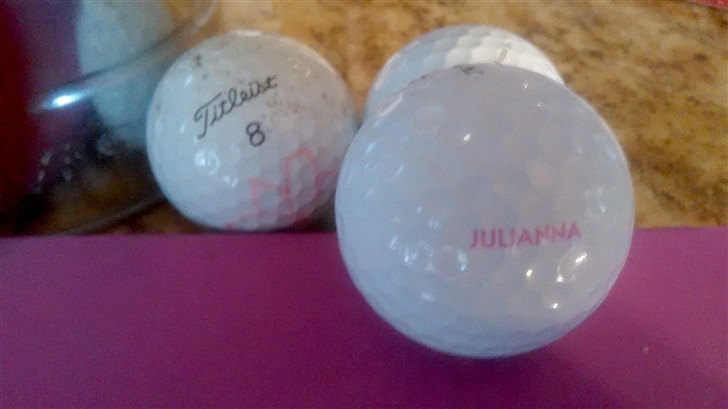 Favorite golf ball model (and any personalization!): Titleist ProV1 - numbered 8 and "JULIANNA" in pink - for my provisional ball, I draw a flower to distinguish it from the original ball.  Unfortunately, I seem to need a provisional ball more than I would like to admit so the delineation is important. I used to also have a perfect black line on my golf balls but found that "lining up perfectly" did not present better results.  The flower helps me to remember to relax, enjoy and smell the flowers.  So, when I look at that provisional ball with that flower drawn on it, I usually smile instead of get more tense.