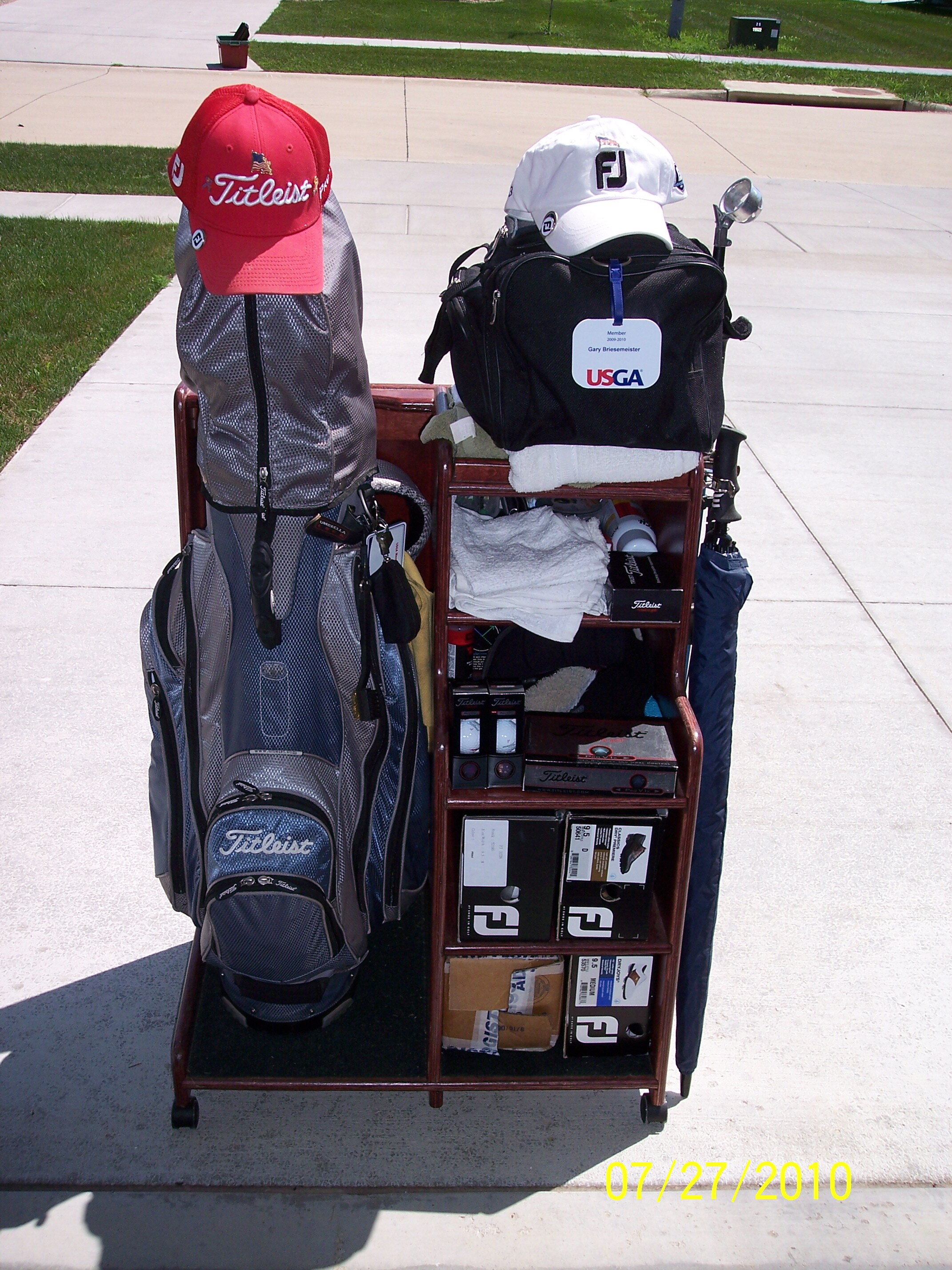I thought that some of you might like to see how I havesome of the gear stored while not in use. I built this 2 years ago after seein something similar in a golf mag. I did a few things different, one by adding wheels to the base and another by adding one more shelf. If anyone is interested, I can take the measurements and send them along..