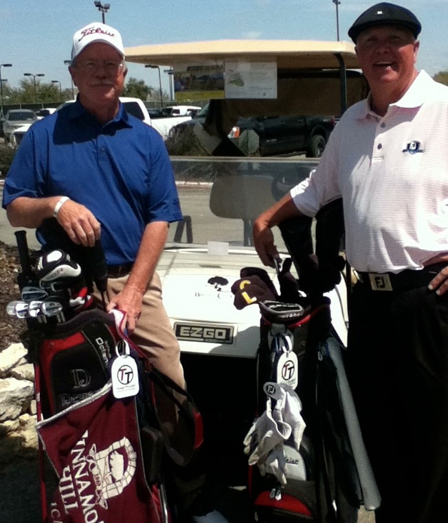 Here are a pair of TT bag tags. Played three days with Freddy at Walnut Creek CC in Mansfield, TX. Freddy's wife snapped this after our fourth and final round Friday morning.
