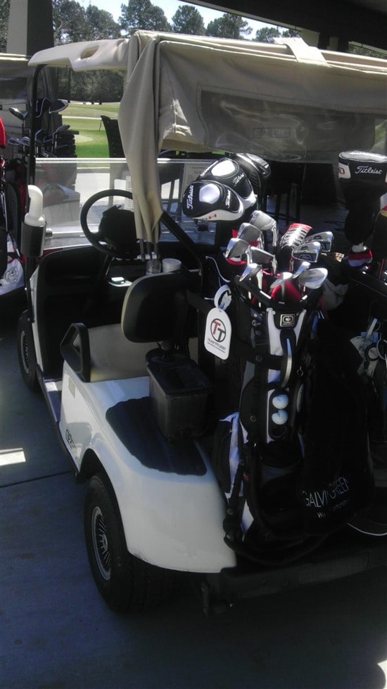On Monday, the 11th, mine was loaded on the cart waiting to start a pro scratch tournament at Walden on Lake Conroe, Conroe, TX. Just wish the golf played by our foursome had been as good looking as the tag.